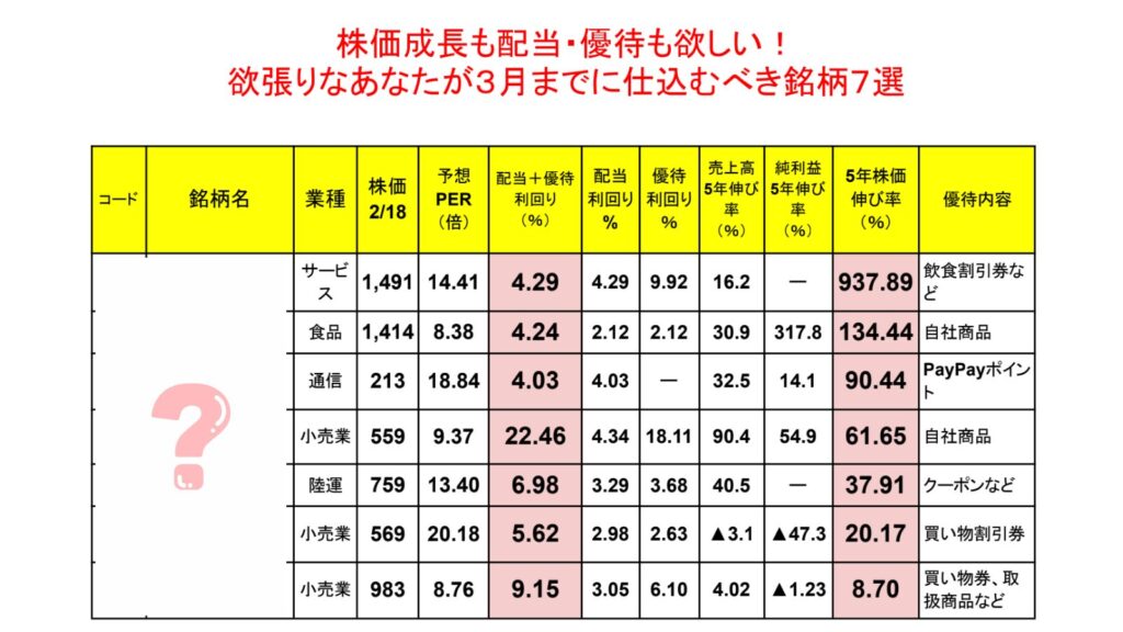 日本で最も多い3月決算企業の中から「配当利回り+優待利回り」の総合利回りが4%以上の銘柄を中心に7銘柄をリストアップ😳‼️