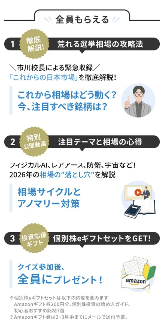 選挙の相場を振り返りながら、市川校長が「2026年の注目すべき株」をわかりやすく動画で解説してくれるよ☺️