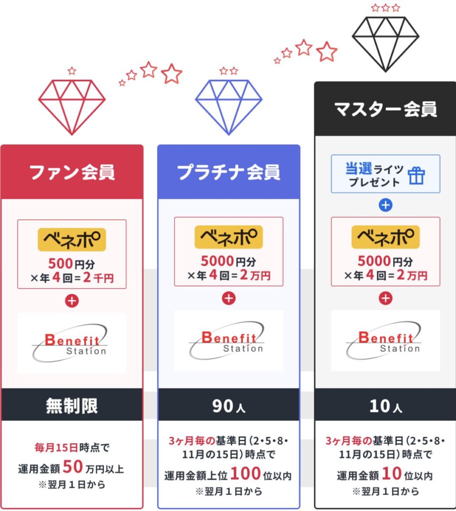 運用額50万以上で、年4回500円分のベネポがもらえるよ☺️