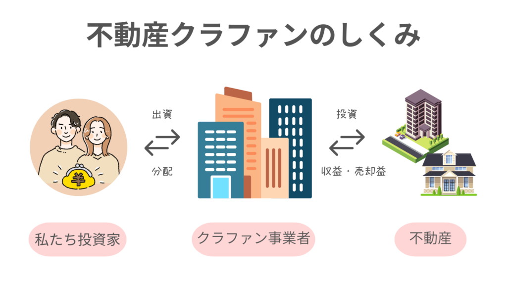 「不動産クラウドファンディング(クラファン)」とは、インターネット上でたくさんの人(投資家)が少額ずつ出資して、不動産に投資する仕組みだよ💁♀️