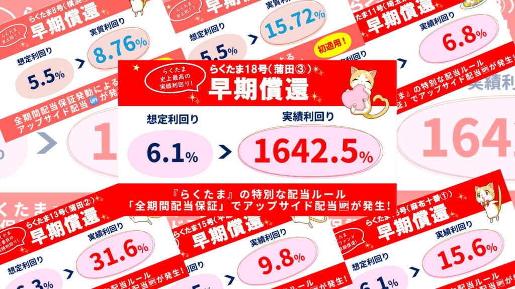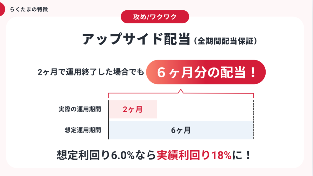 でも、らくたまはアップサイド配当(全期間配当保証)を採用しているから、早期運用が終了しても利回りも配当も変わらないよ🥰