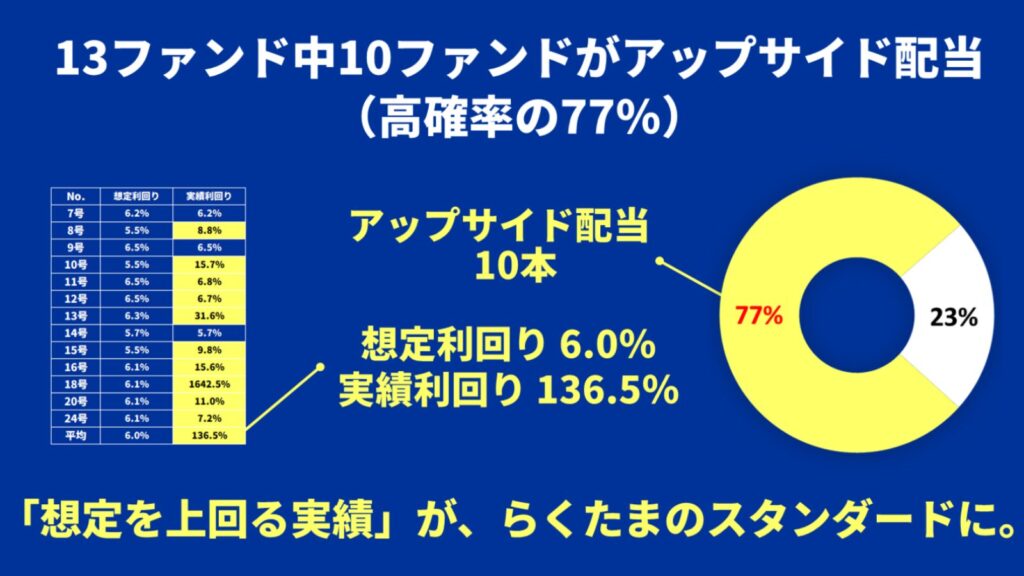 全体の77%でアップサイド配当が実現してるのは本当にすごい!(2025年10月時点)